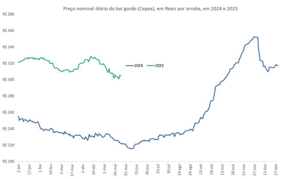O preço futuro do boi gordo segue mais firme nesse final de maio, enquanto o mercado físico alcançou o menor valor médio na parcial de maio desde outubro de 2024.