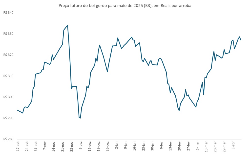O preço esperado do boi gordo para maio de 2025, de R$327,1 por arroba (valor de ajuste) em abril (9) precifica uma alta de 1,0% em relação a referência no físico (Datagro), enquanto o vencimento de outubro, de R$353,1 por arroba, um ganho de 9,1%.