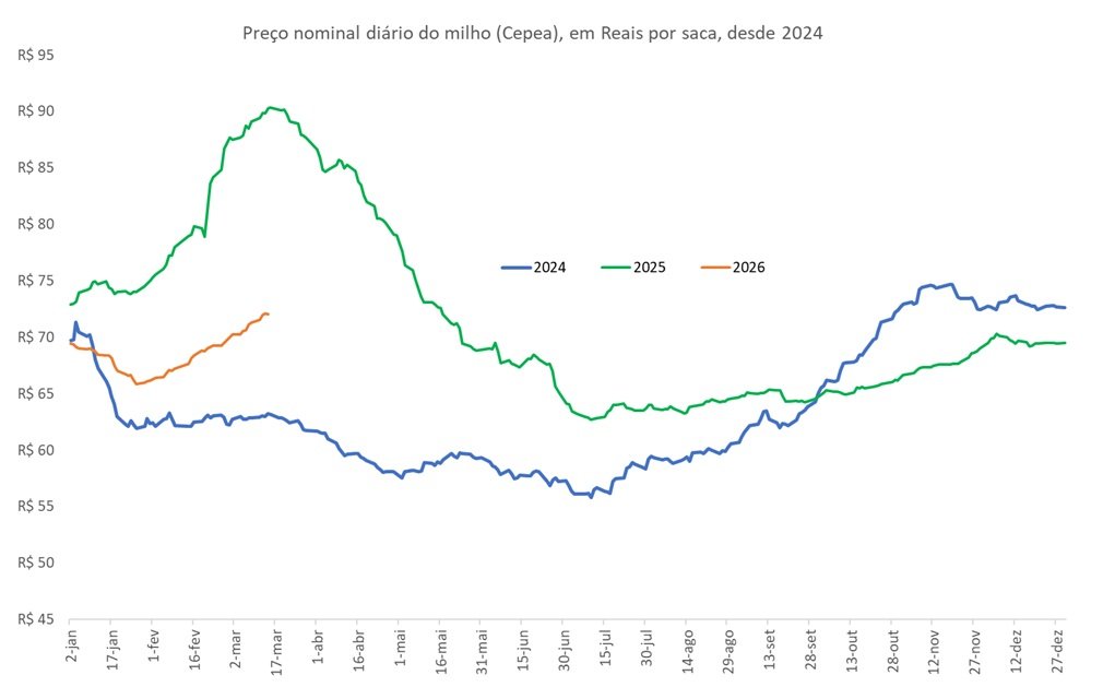 O preço futuro do milho para maio de 2026, por exemplo, foi cotado R$75,8 por saca em março (11), enquanto em março (17), a expectativa de preço para o vencimento caiu para R$72,1 por saca.