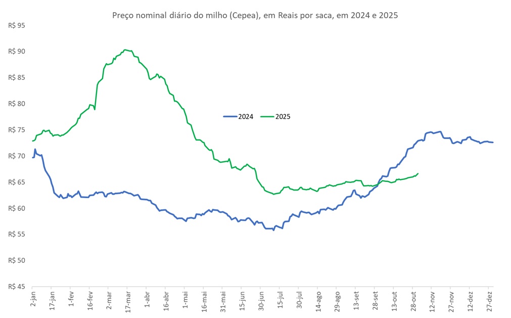 Vale observar também que apesar da recuperação no preço do milho ao longo de outubro (Figura), o valor de 2025 passou a ficar abaixo do praticado no mesmo período do ano anterior, mostrando que o movimento de valorização frustrou o agricultor no ano.