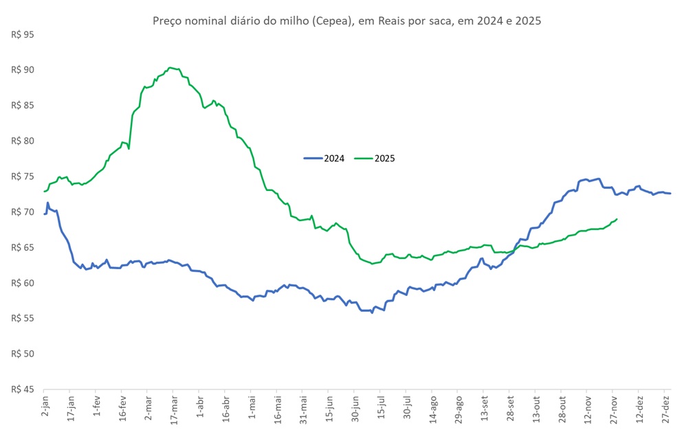 Vale observar também que o preço médio do milho (Cepea) em novembro de 2025, de R$67,5 por saca foi 8,3% menor que o valor médio nominal de novembro de 2024 (R$73,7).