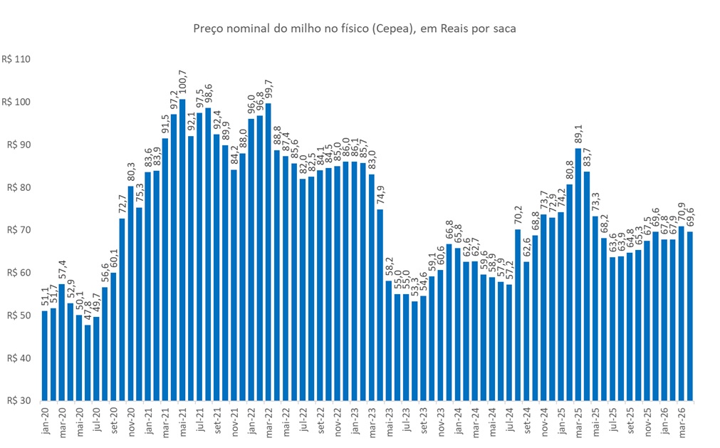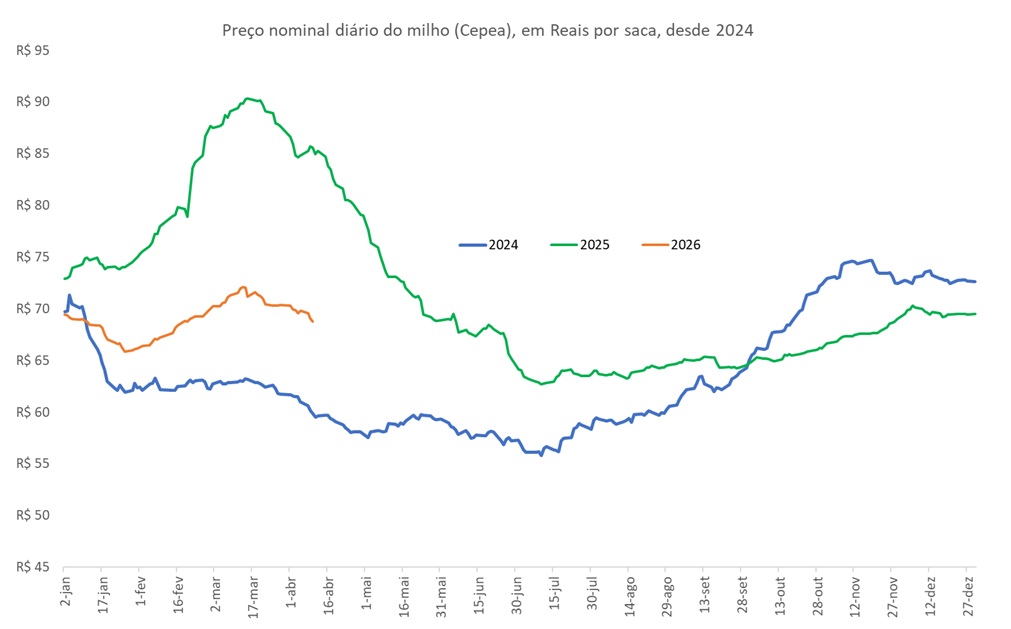 O preço médio do milho (Cepea) na parcial de abril de 2026 (até o dia 13) também voltou a ficar abaixo de R$70,0 por saca e em patamares muito abaixo do praticado em abril de 2025 (R$83,7).
