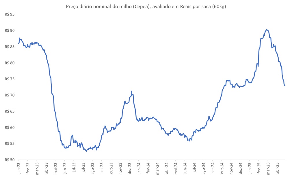 O preço médio do milho (Cepea) na parcial de maio, até a parcial de maio (16) de R$75,5 por saca foi 9,8% menor que o valor médio nominal de abril (R$83,7) e o menor valor mensal desde janeiro (R$74,2). Nesse ritmo de queda, o preço do milho deve renovar a mínima mensal em maio. Contudo, quando comparado ao mesmo período do ano anterior, o preço do grão subiu 28,1%. Isso porque em maio de 2024 o preço do milho foi cotado, em média, a R$58,9 por saca.
