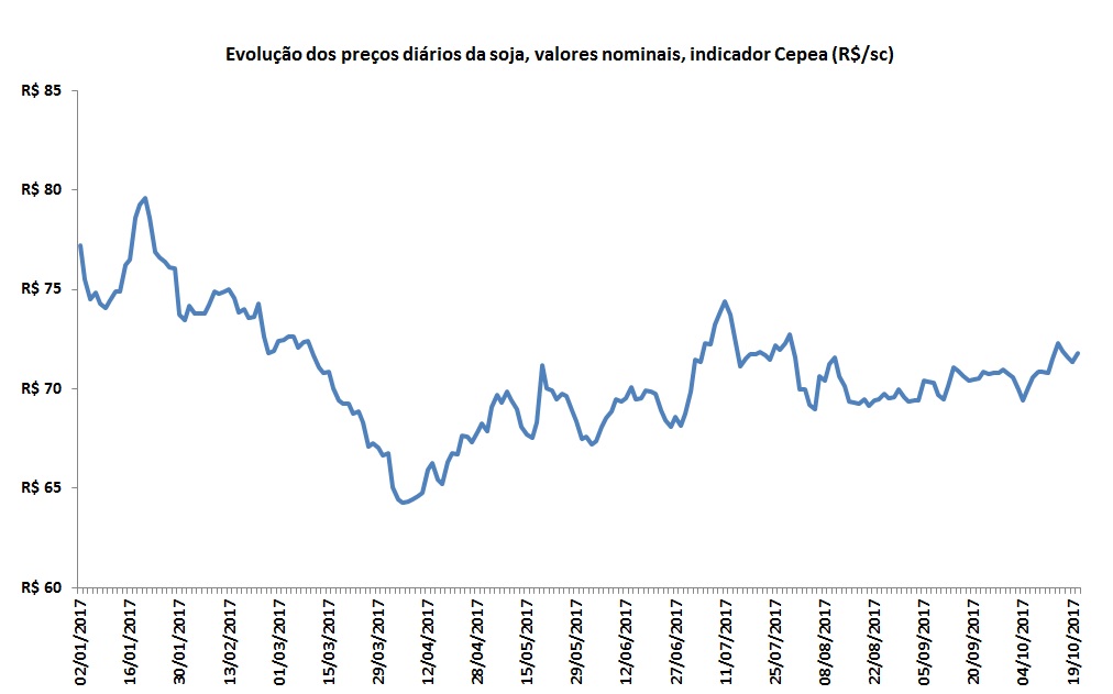 No entanto, ao longo de 2017 o preços da soja acumulam queda de 7,0% (até 20 de outubro), variando entre a mínima abaixo de R$65,0 (abril) e a máxima próximo de R$80,0 por saca (janeiro).