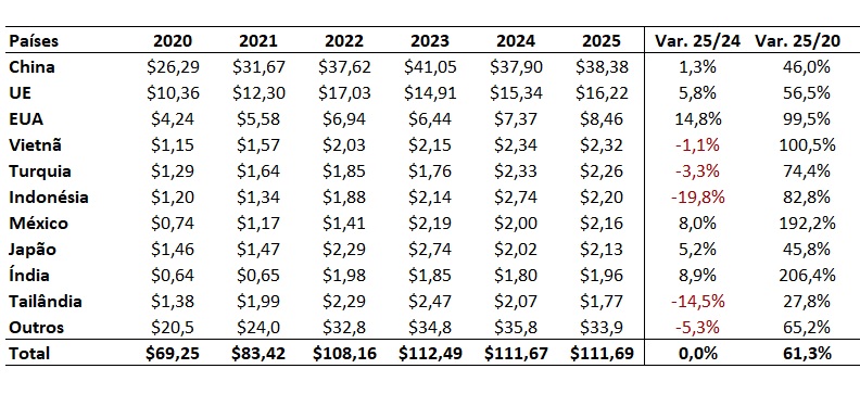 Vale destacar também que apesar da queda de venda de produtos do agronegócio do Brasil para alguns dos principais importadores em 2025, como Vietnã, Turquia e Indonésia, todos, sem exceção, acumularam forte alta quando os dados de importação de 2025 são comparados com 2020 (Tabela).