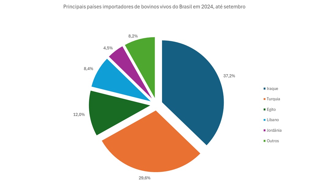 A Figura ilustra a participação, por país, na compra de bovinos vivos do Brasil no acumulado até setembro, em 2024, avaliada pelo faturamento, segundo dados da COMEX.