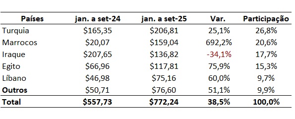 Entre os principais países importadores de bovinos vivos do Brasil em 2025, o destaque tem sido a Turquia, Marrocos, Egito e o Líbano, com forte alta frente ao ritmo de compra de 2024 (Tabela).