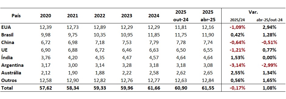 A Tabela a seguir apresenta os dados da produção de carne bovina no mundo e principais países produtores, em milhões de toneladas em equivalente carcaça, entre 2020 e a expectativa para 2025, segundo USDA de abril de 2025.