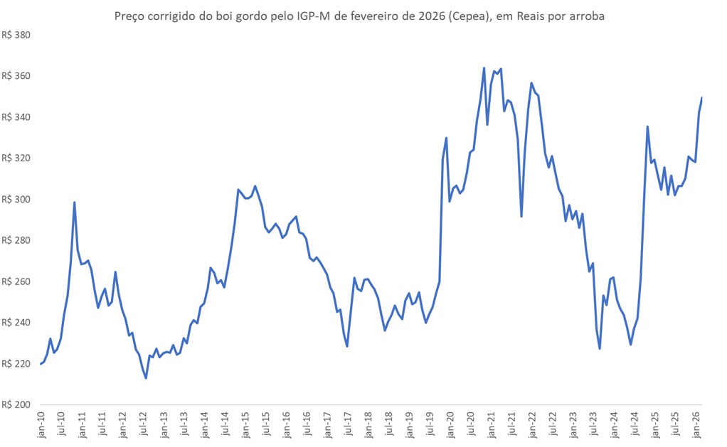 A Figura a abaixo apresenta a evolução do preço do boi gordo (Cepea), corrigido pelo IGP-M de fevereiro de 2025, em Reais por arroba, entre janeiro de 2010 e a parcial de março de 2026.