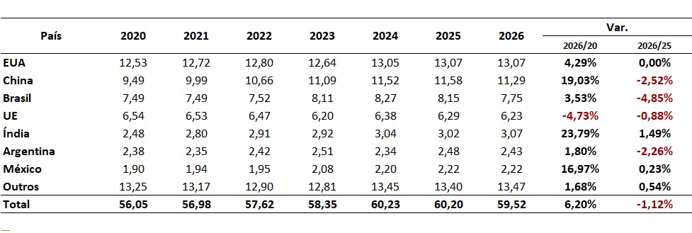 A Tabela apresenta os dados de produção mundial e entre os principais países produtores de carne bovina, em milhões de toneladas em equivalente carcaça, entre 2020 e a expectativa para 2026, segundo dados do USDA.
