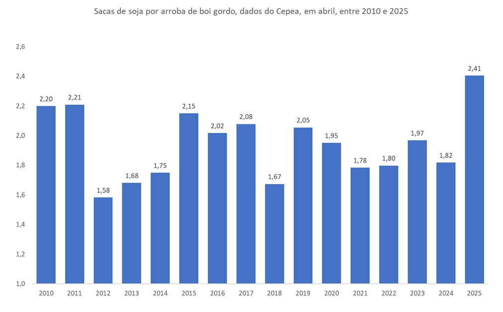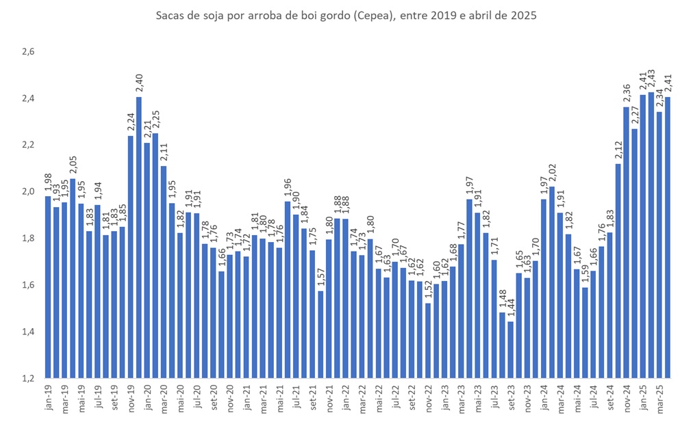 O indicador de sacas de soja por arroba de boi gordo em abril de 2025, de 2,41 foi o maior para o período do ano ao longo da série iniciada em 2010.