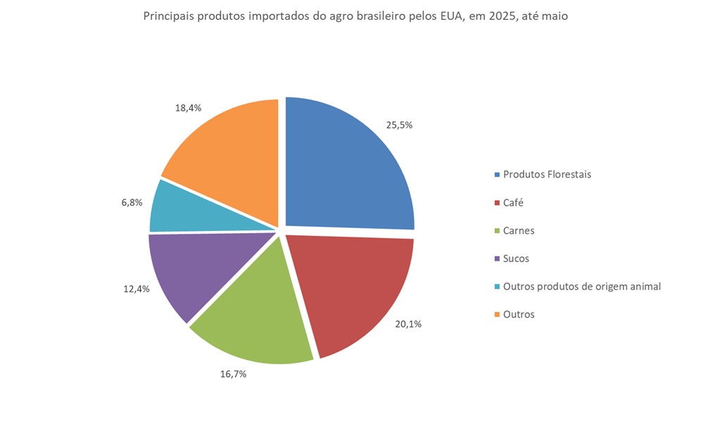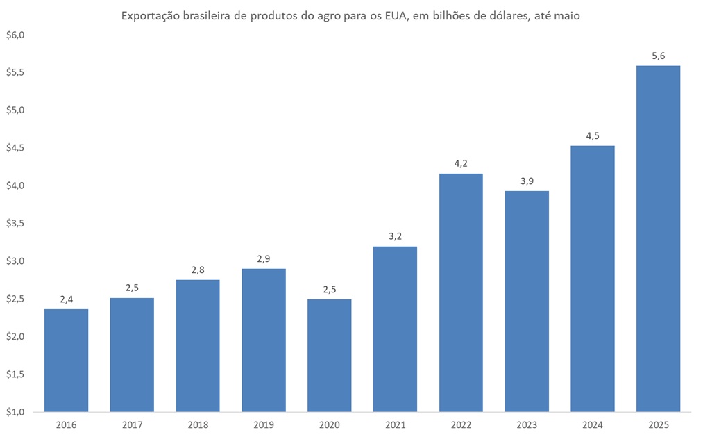 Os EUA importaram, do Brasil, o equivalente a US$5,6 bilhões em produtos do agronegócio, o maior patamar da história para o período do ano, até maio. O valor é US$1,1 bilhão acima do observado em 2024, até maio.