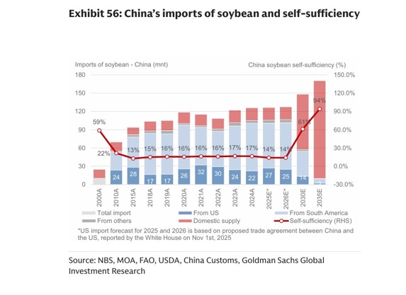 Um relatório do Goldman Sachs (dezembro/2025) trouxe uma tese incômoda: se uma combinação de tecnologias e ajustes de demanda avançar como o previsto, a China pode reduzir de forma profunda a necessidade de importar soja.