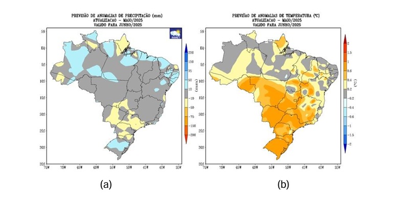 A Figura abaixo apresenta a previsão de anomalias de (a) precipitação e (b) temperatura média do ar do modelo climático do INMET, para o mês de junho de 2025.