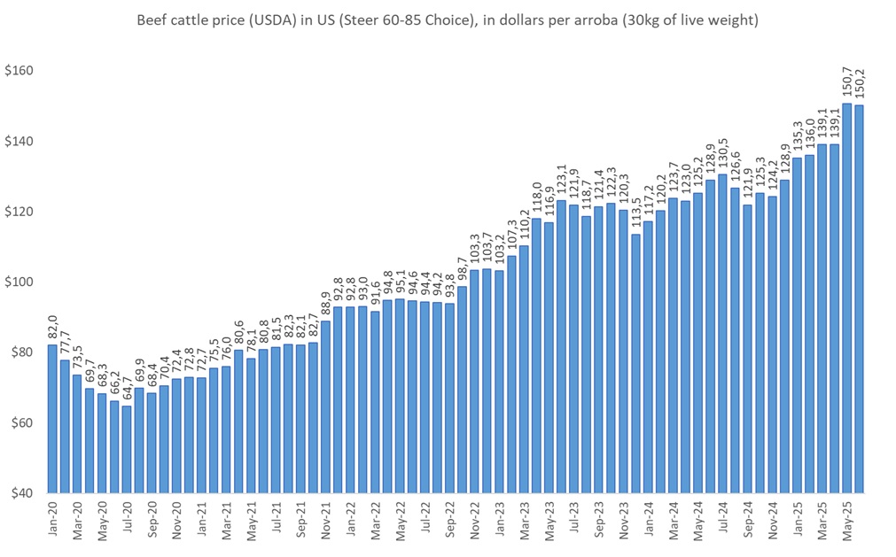 The price of cattle in the US (Choice 60-85) was of US$150.2 per arroba (30kg of live weight), very close to the previous month’s price and 16.5% higher than in the same period in 2024 (US$128.3).