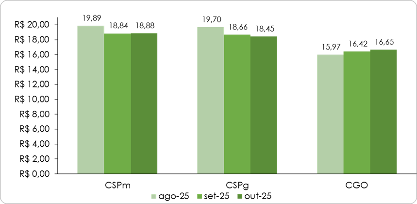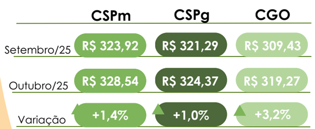 Muito possivelmente, os três sistemas analisados registraram os menores custos de arroba produzida do ano nos últimos três meses — em agosto para Goiás, em setembro para CSPm e em outubro para CSPg.