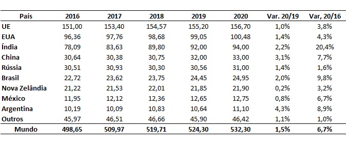 Vale destacar que, se concretizada a projeção, em 2020 a produção mundial de leite deve alcançar patamar recorde. Aliás, em todos os anos da série, a produção de leite no mundo só cresceu (Tabela).