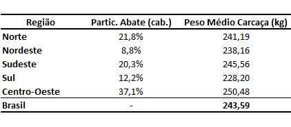 A região norte foi a que apresentou a segunda maior participação no abate de bovinos, com 21,8%, pouco acima da participação da região sudeste (20,3%). Por outro lado, o peso médio de carcaça da região norte, de 241,19kg é menor que a observada na região sudeste.