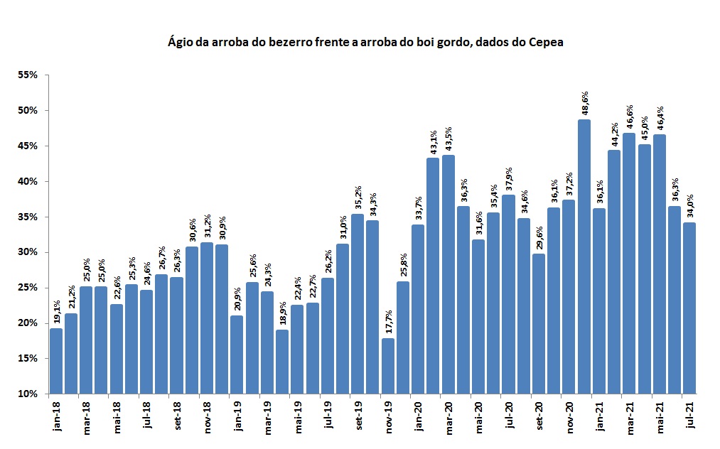 Além do menor valor de 2021 até julho, o ágio do bezerro em relação ao boi gordo foi menor que o observado em julho de 2020, uma vez que há um ano o valor ficou em 37,9% (Figura).