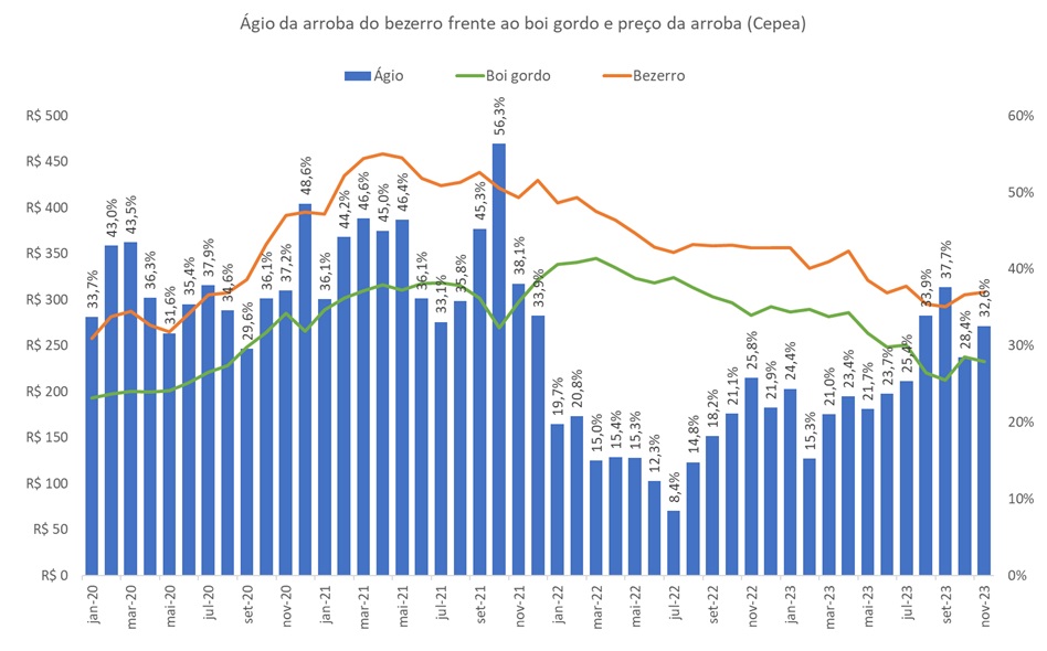 O ágio do bezerro na parcial de novembro de 2023 foi de 32,6%, valor acima do observado em novembro de 2022 (25,8%) e maior que a média de 10 anos para um mês de novembro, de 29,4%.