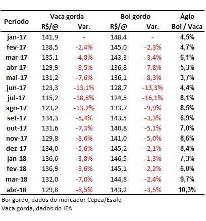 A Tabela a seguir apresenta os dados de preços do boi gordo, vaca gordo e o respectivo ágio do boi em relação a vaca, de janeiro de 2017 a abril de 2018.