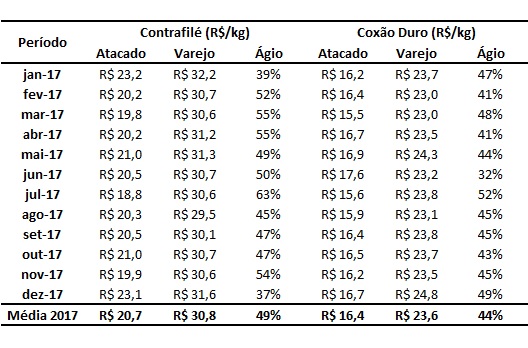O fato é que no ano de 2017 e em termos médios, o preço do contrafilé no varejo foi cerca de 49,0% maior que o valor observado no atacado paulista. No caso do coxão duro o ágio entre o preço praticado no varejo e no atacado foi de 44,0%.