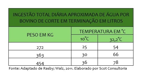 Tabela 1. Ingestão total diária aproximada de água por bovino de corte em terminação, em litros.