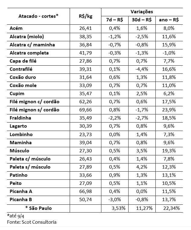 Já a média dos cortes do dianteiro subiu 1,8%, com cinco cortes em alta e um estável, com destaque para o peito e a paleta sem músculo.