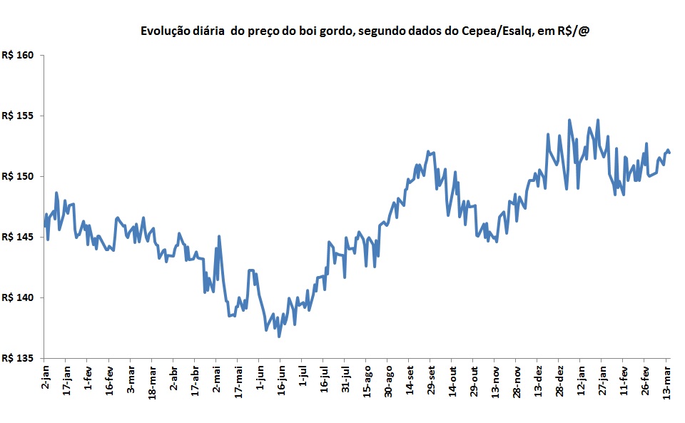Na média parcial de março, até o dia 15, a arroba do boi gordo foi cotada a R$151,40, valor 7,7% superior a média observada em março de 2018.