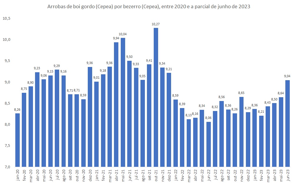 A quantidade de arrobas de boi gordo por bezerro alcançou, na parcial de junho de 2023, o maior valor desde dezembro de 2021.