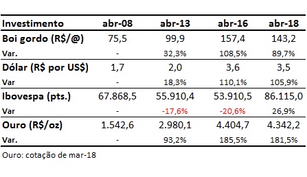 A Tabela a seguir apresenta os preços e a variação do boi gordo comparado a outros investimentos (dólar, Ibovespa e ouro) em abril de 2008, abril de 2013 e abril de 2016 em relação aos valores de abril 2018. Vale lembrar que os preços do boi gordo referem-se aos valores do indicador Cepea/Esalq.