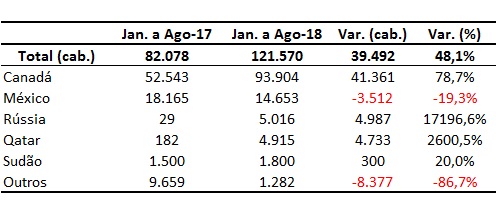 E o destaque positivo no período foi a Rússia que, em 2017, praticamente não realizou compras até agosto (apenas 29 animais) e em agosto de 2018 já acumula importação de 5,01 mil animais. O Qatar é outro destaque positivo, a exemplo da Rússia, com compra bastante discreta em 2017 e um salto significativo em 2018. No caso do Qatar as compras evoluíram de 182 cabeças na parcial até agosto de 2017 para 4,90 mil animais no mesmo período de 2018.