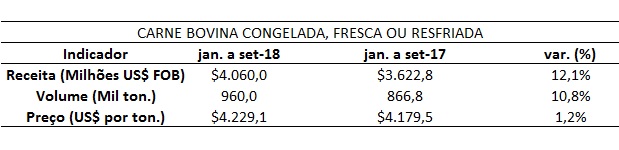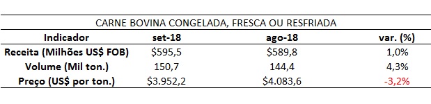 No mês de agosto de 2018 a receita com a exportação de carne bovina do Brasil foi de US$589,8 milhões e os embarques de 144,4 mil toneladas. Desse modo, os valores de setembro de 2018 foram, respectivamente, 1,0% e 4,43% superiores, em relação aos valores observados em agosto de 2018.