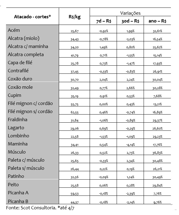 A expectativa no curto prazo é de melhora nas vendas, após um mês variando em ritmo lento a lateralizado. Com o início de julho e o pagamento dos salários, espera-se que o mercado ganhe fôlego, abrindo espaço para novos reajustes nos preços da carne bovina no atacado.