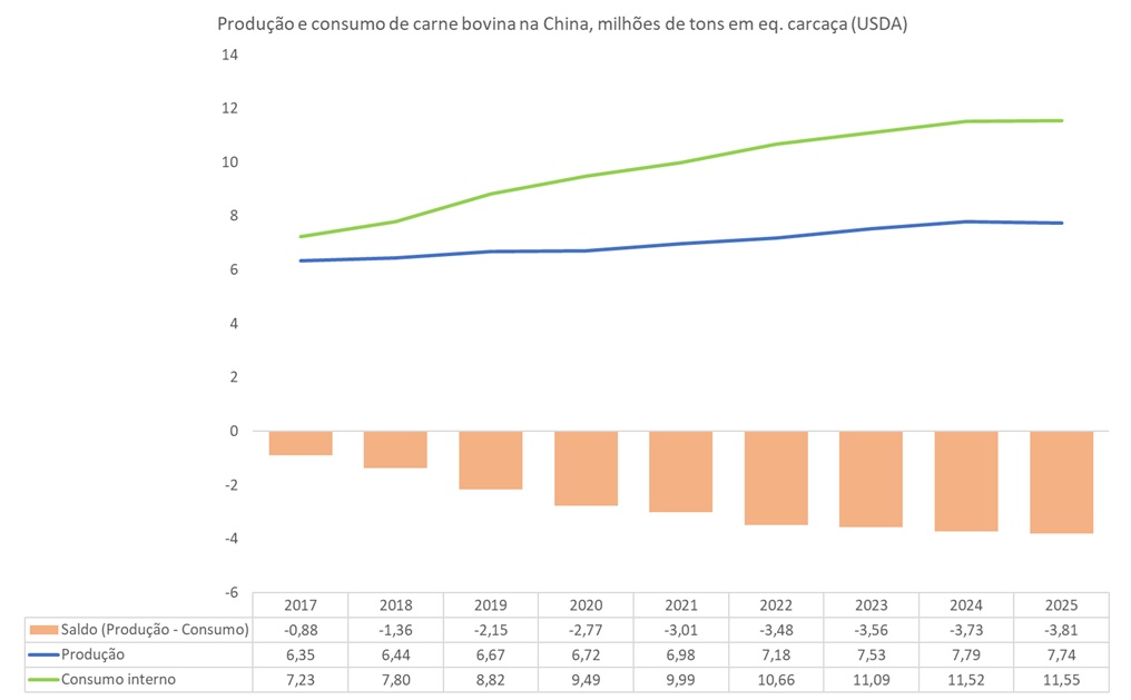 A diferença negativa entre a capacidade atual de produção de carne bovina na China e a demanda do país asiático tem aumentado ao longo dos anos e em 2025 deve ficar próxima de 4,0 milhões de toneladas em equivalente carcaça.