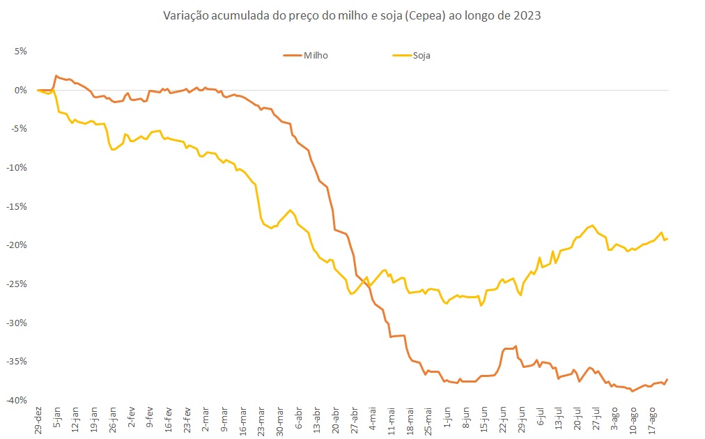 A Figura ilustra a variação diária acumulada do preço do milho (Cepea) e da soja (Cepea, Paranguá-PR) ao longo de 2023.