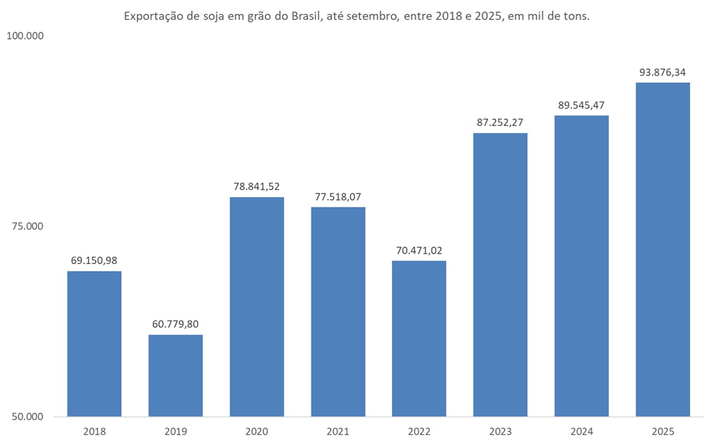 A Figura apresenta os dados de exportação de soja em grão do Brasil, em mil toneladas, no acumulado até setembro, entre 2018 e 2025, segundo dados da COMEX.