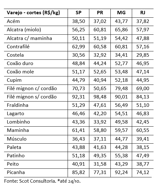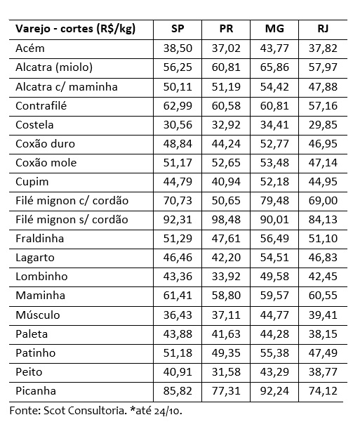 Por outro lado, no Rio de Janeiro, houve alta na cotação média, de 0,3%, com sete cortes apresentando acréscimo, dez estáveis e quatro em queda. A maior variação foi o recuo de 1,7% na costela, seguido da queda de 1,5% no peito e da alta de 1,5% no contrafilé.