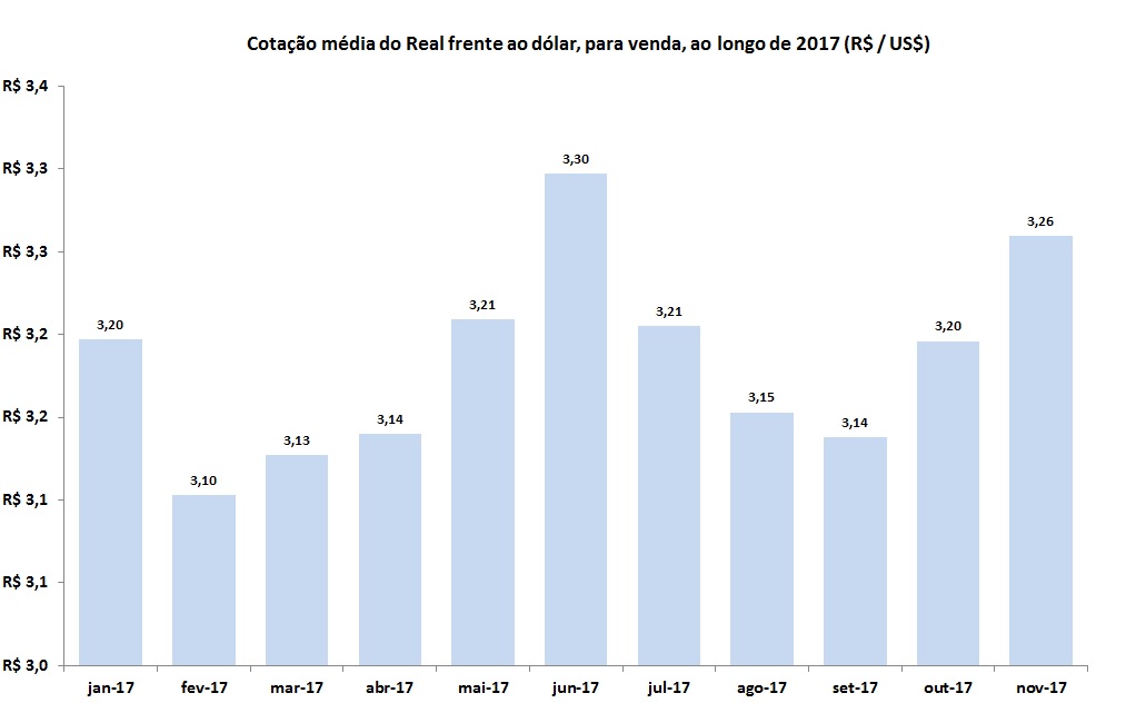 O Farmnews apresenta a cotação do Real frente ao dólar, em termos médios mensais, ao longo de 2017.