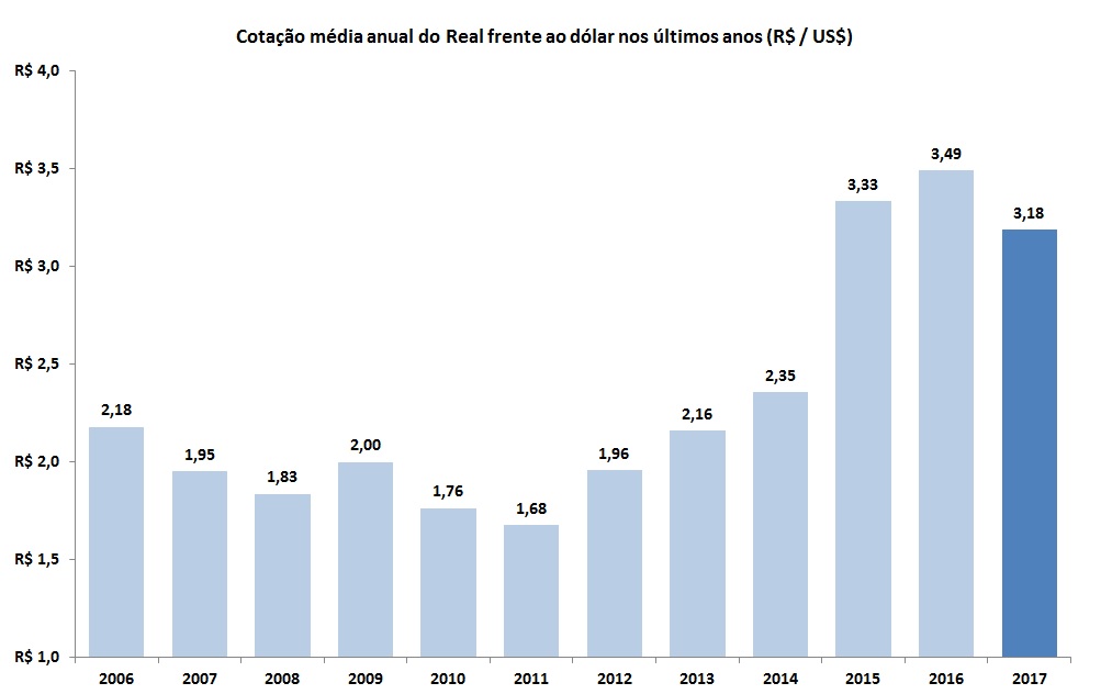 Apesar da média parcial de 2017 estar abaixo do valor médio observado e, 2015 (R$3,33) e 2016 (R$3,49), a cotação do Real está muito acima do valor médio observado ao longo da serie histórica avaliada desde 2006.