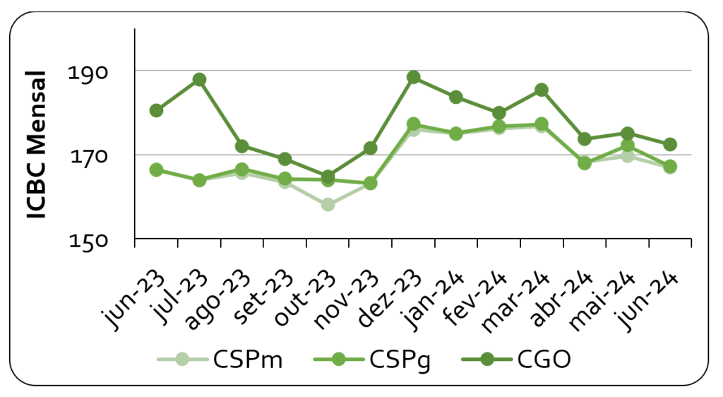 Considerando a avaliação em um período mais longo, de junho de 2023 a junho de 2024, constatamos variações no ICBC, com aumentos de 0,3% e 0,5% para CSPm e CSPg, respectivamente, e uma redução de 4,5% para CGO. Ou seja, ao longo dos últimos 13 meses houve pequeno aumento de custo de produção para as propriedades do estado de São Paulo e aumento de 4,5% para a propriedade em Goiás