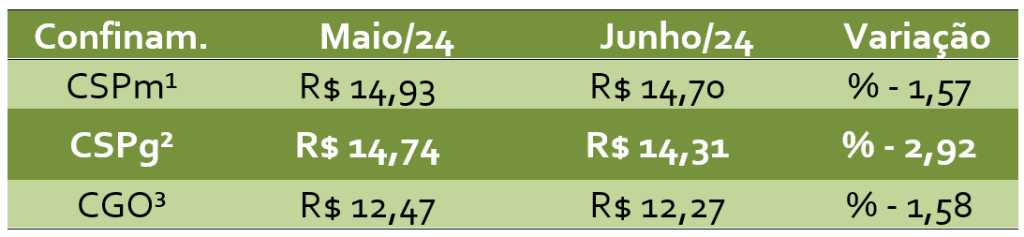 Os custos por arroba produzida para bovinos confinados em junho de 2024 reduziram para CSPm (1,59%), CSPg (2,92%) e CGO 1,59%) em comparação com o mês anterior!