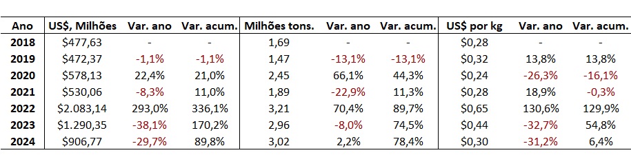 A Tabela a seguir apresenta os dados de importação das matérias-primas pelo Brasil, nos meses de abril, entre 2018 e 2024, segundo dados da COMEX.