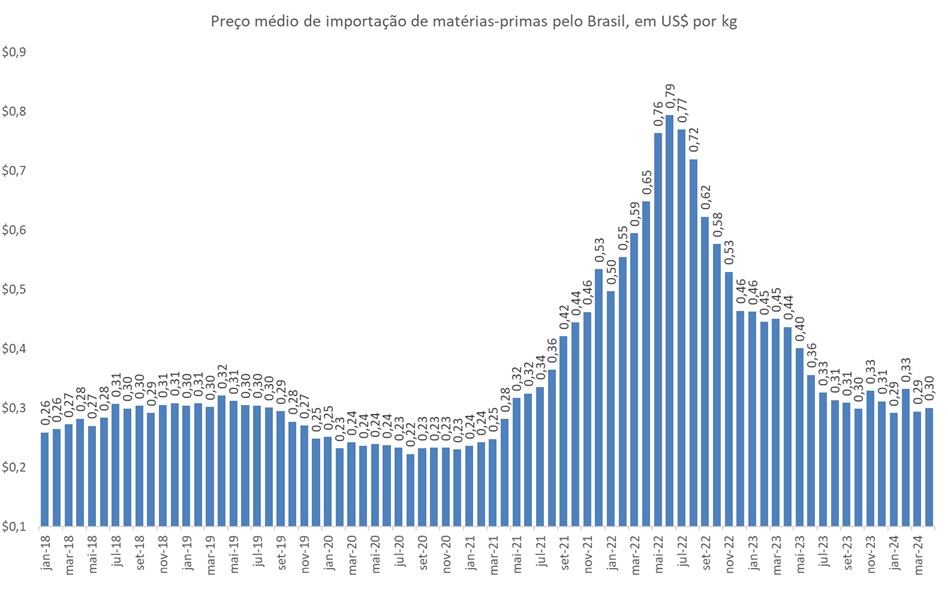Em abril de 2024 o preço médio de importação de matérias-primas pelo Brasil apresentou leve alta frente ao valor praticado no mês anterior (Figura), mas segue relativamente estável em 2024, oscilando em torno de US$0,29 e US$0,33 por kg.
