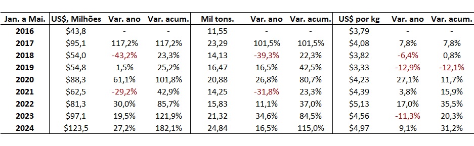 A Tabela a seguir apresenta os dados da importação de carne bovina in natura do Brasil pela Arábia Saudita entre janeiro e maio, de 2016 a 2024, segundo dados da COMEX.