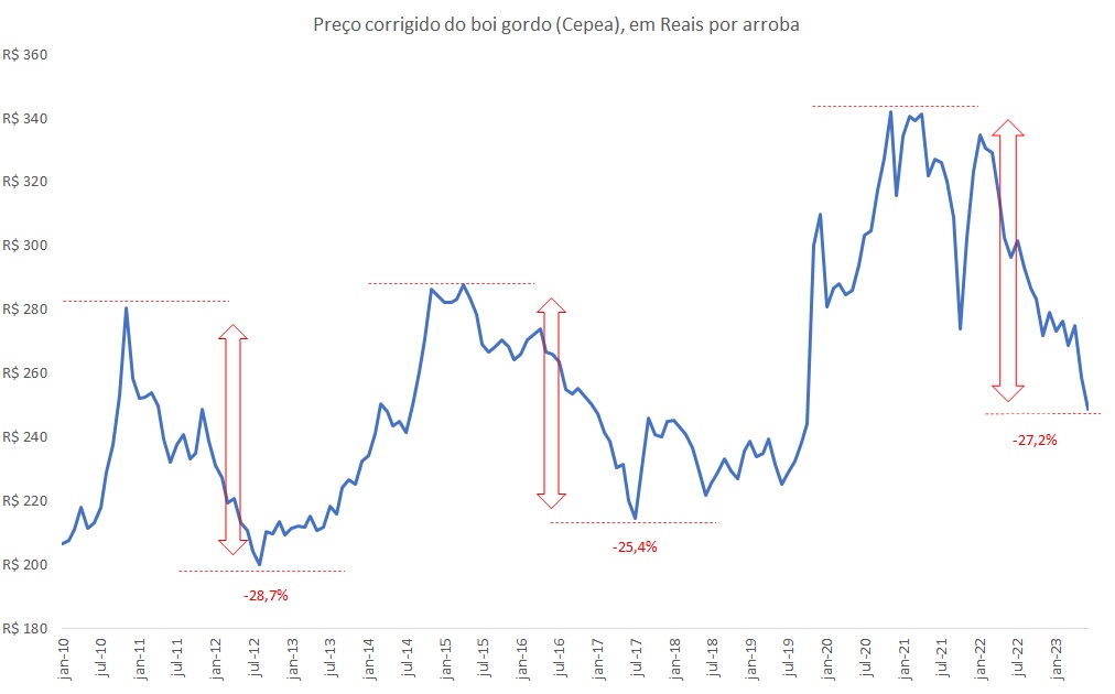 O preço corrigido do boi gordo caiu 27,2% no final do 1º semestre de 2023 frente a máxima de 2020, queda que supera a perda do ciclo de baixa anterior, de 2017, quando a arroba desvalorizou 25,4% comparado a máxima de 2015.