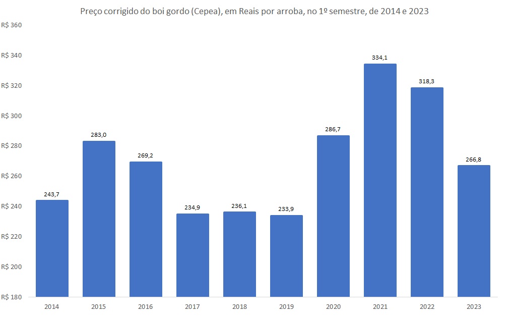 O Farmnews apresenta os dados do preço corrigido do boi gordo no 1º semestre, de 2014 a 2023.