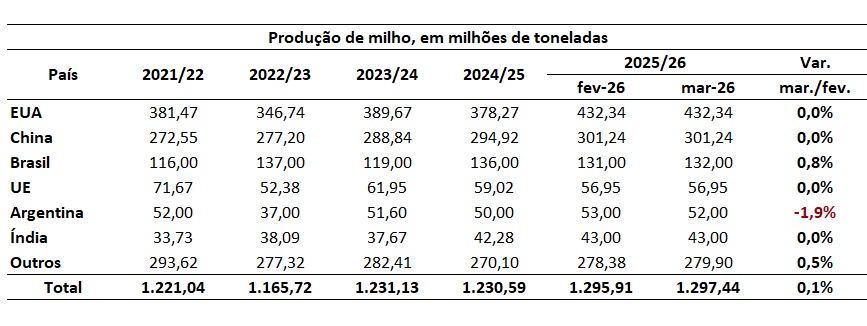 O USDA revisou, em março de 2026, os dados da produção e estoque mundial de milho para a safra 2025/26 e o Farmnews comparou os valores esperados com a estimativa anterior e também com as safras anteriores (Tabelas abaixo).