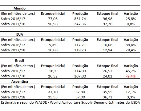 No Brasil, após a alta de 45,7% nos estoques da safra atual, espera-se uma queda de 9,4% na safra de 2017/18. Vale lembrar que a projeção da safra atual é que o estoque final atinja 24,02 milhões de toneladas.