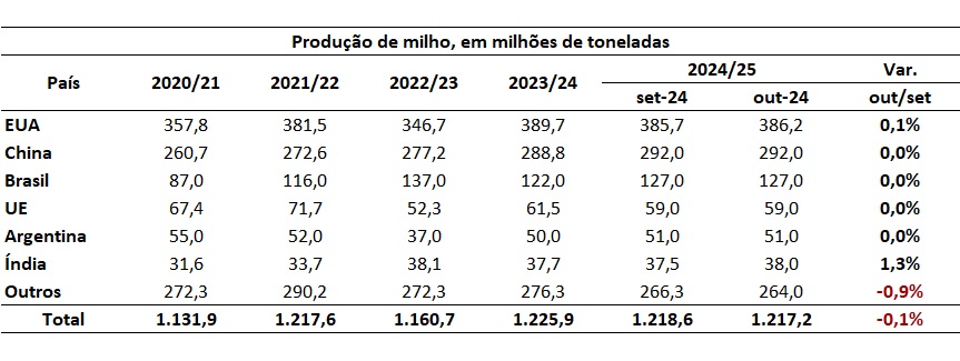 A revisão de outubro de 2024 mostrou leve queda na expectativa de produção mundial de milho, de 0,1%, frente a previsão anterior (set-24), que deve seguir abaixo da produção estimada na safra anterior (2023/24), como mostram os dados da Tabela acima.